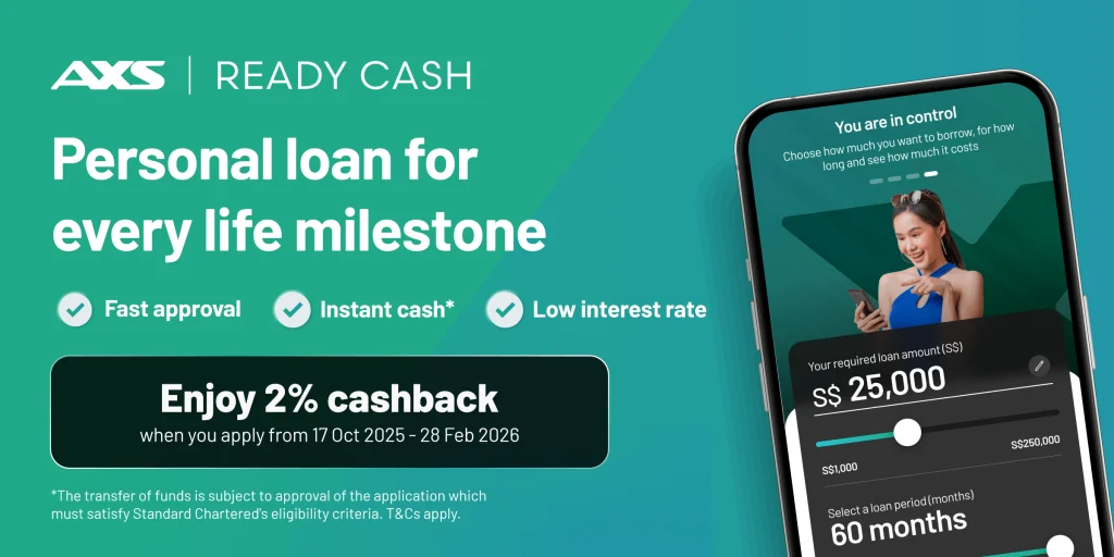 Enjoy interest rates as low as 1.80% p.a. (EIR from 3.44% p.a.) with fast approval and instant cash disbursement. Earn 2% cashback during our promo period! Loan application via AXS m-Station app.