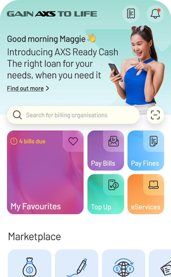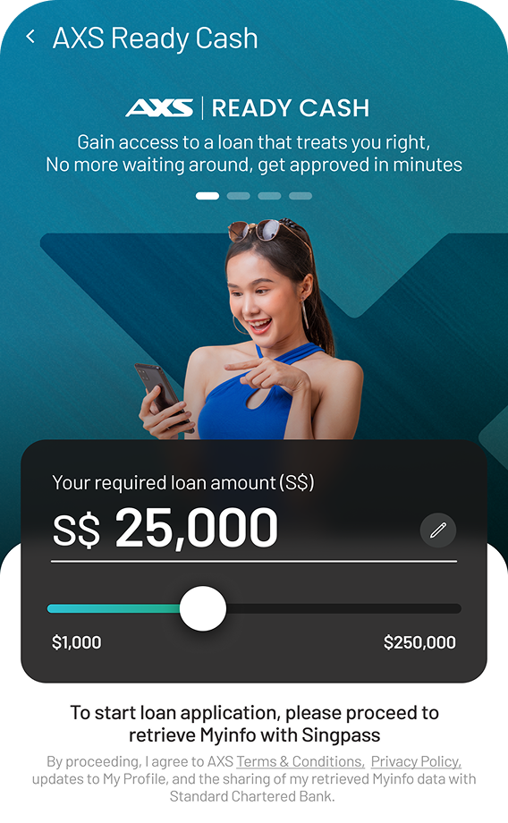 AXS Ready Cash is a digital loan service underwritten by Standard Chartered Bank (Singapore) Limited (SCB) available on AXS m-Station, allowing eligible users to apply for and receive personal loans conveniently. The loan application process is seamless, with competitive interest rates and flexible repayment options.