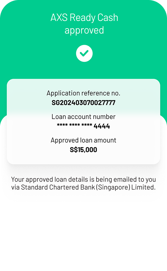 AXS Ready Cash is a digital loan service underwritten by Standard Chartered Bank (Singapore) Limited (SCB) available on AXS m-Station, allowing eligible users to apply for and receive personal loans conveniently. The loan application process is seamless, with competitive interest rates and flexible repayment options.